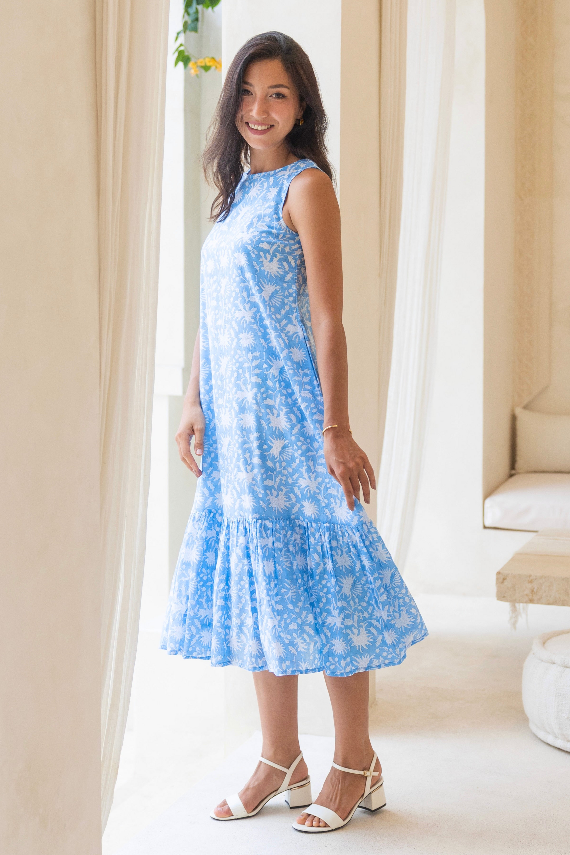 A sleeveless, midi-length A-line dress made from a light and breathable muslin fabric.