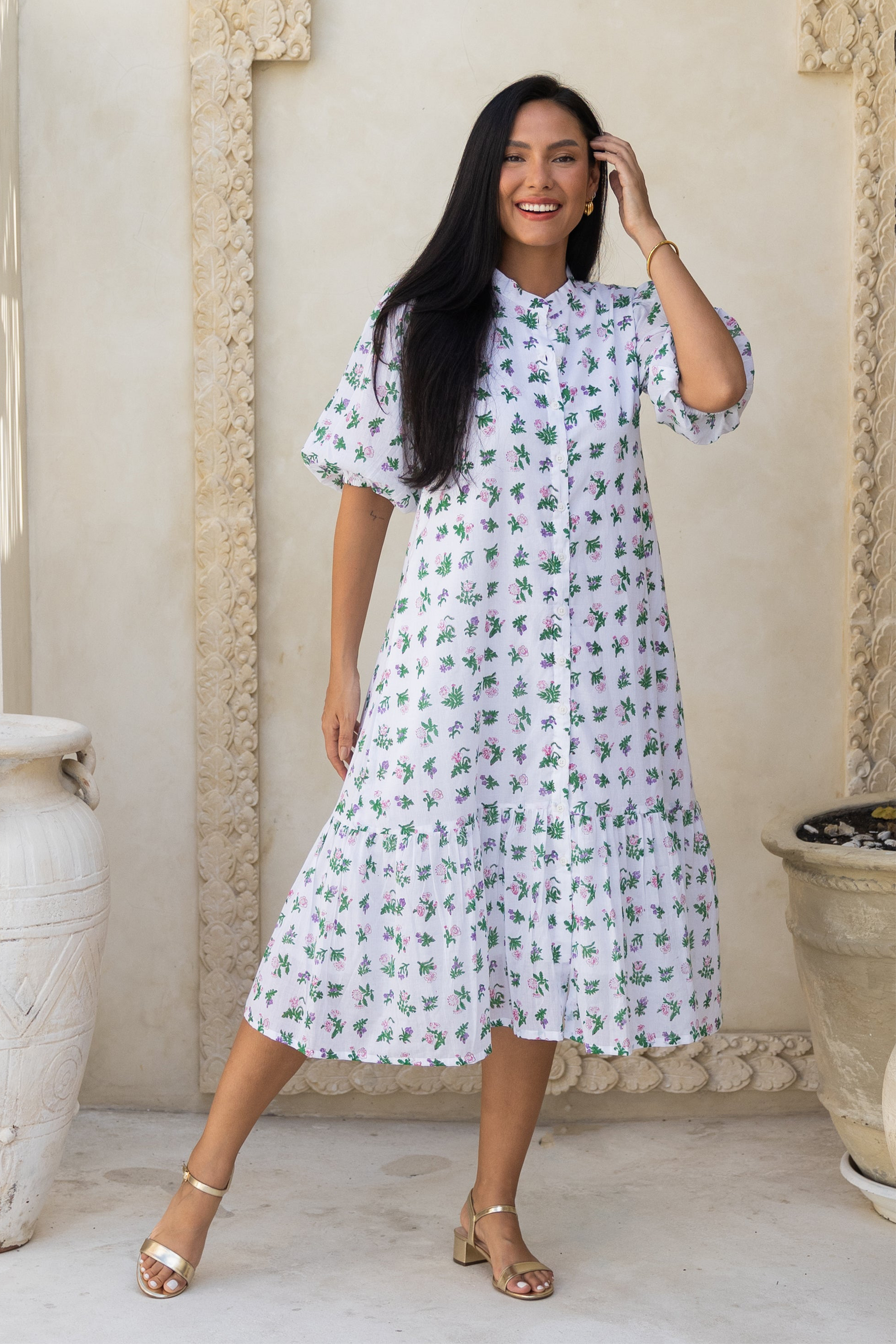 This midi-length A-line beauty is crafted in light, breathable muslin. Designed with a neat chinese collar, soft tier that add a graceful sway, and sleeves for extra comfort.