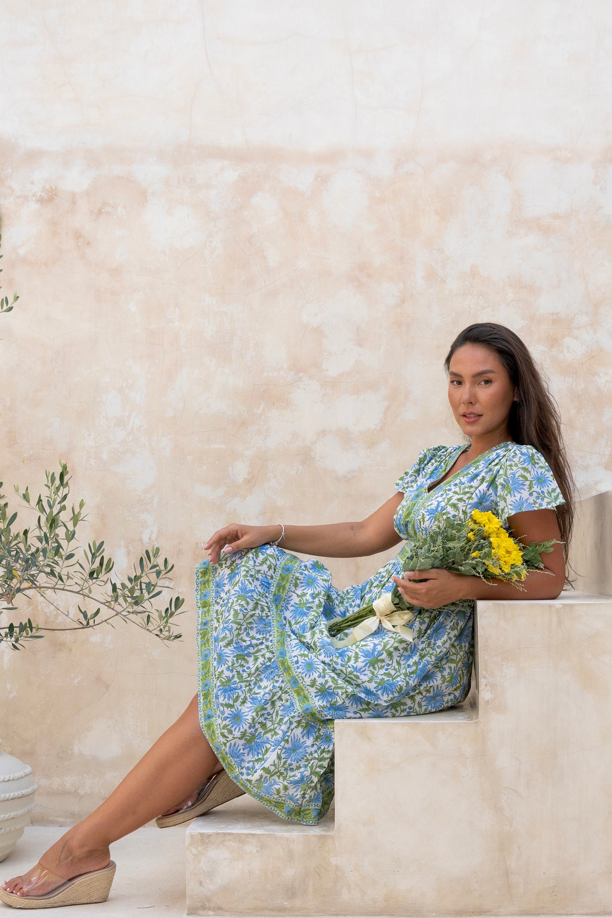 Hand block-printed on fine mul fabric, this style features flattering V neckline, extended cap sleeves, smocked elastic waist at the back and striking border details across the waist and skirt, making this a dress to stand out.