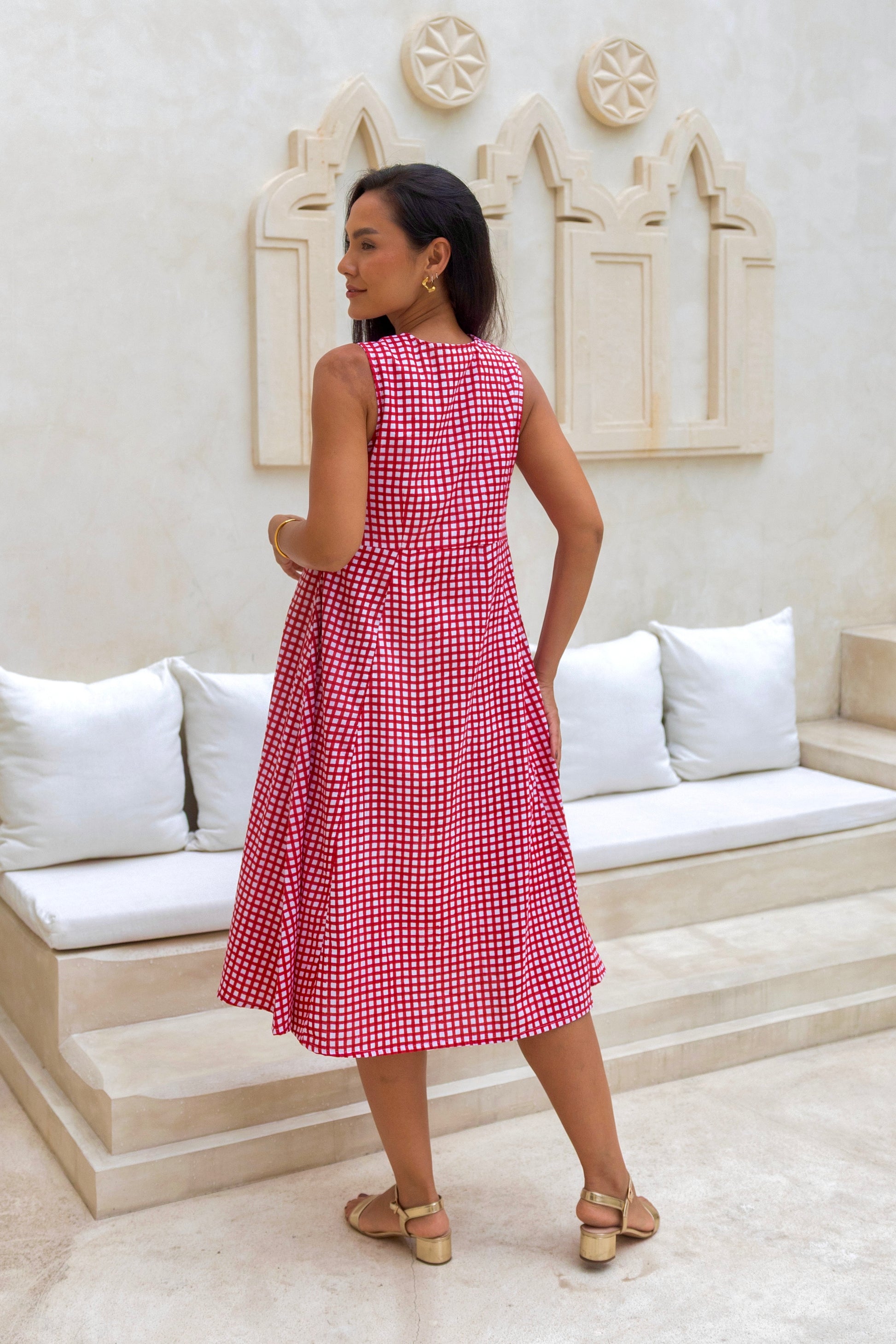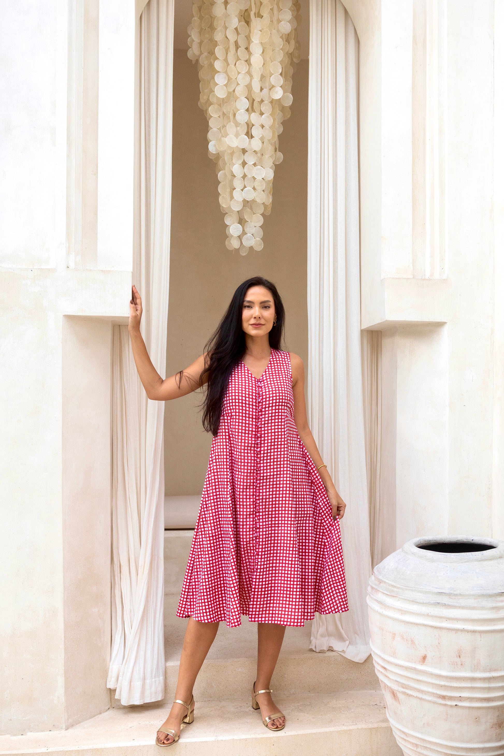 Primrose Dress features a V-neckline, delicate fabric-covered buttons running all the way down, and a gently flared A-line silhouette that flatters every curve — understated yet effortlessly striking.