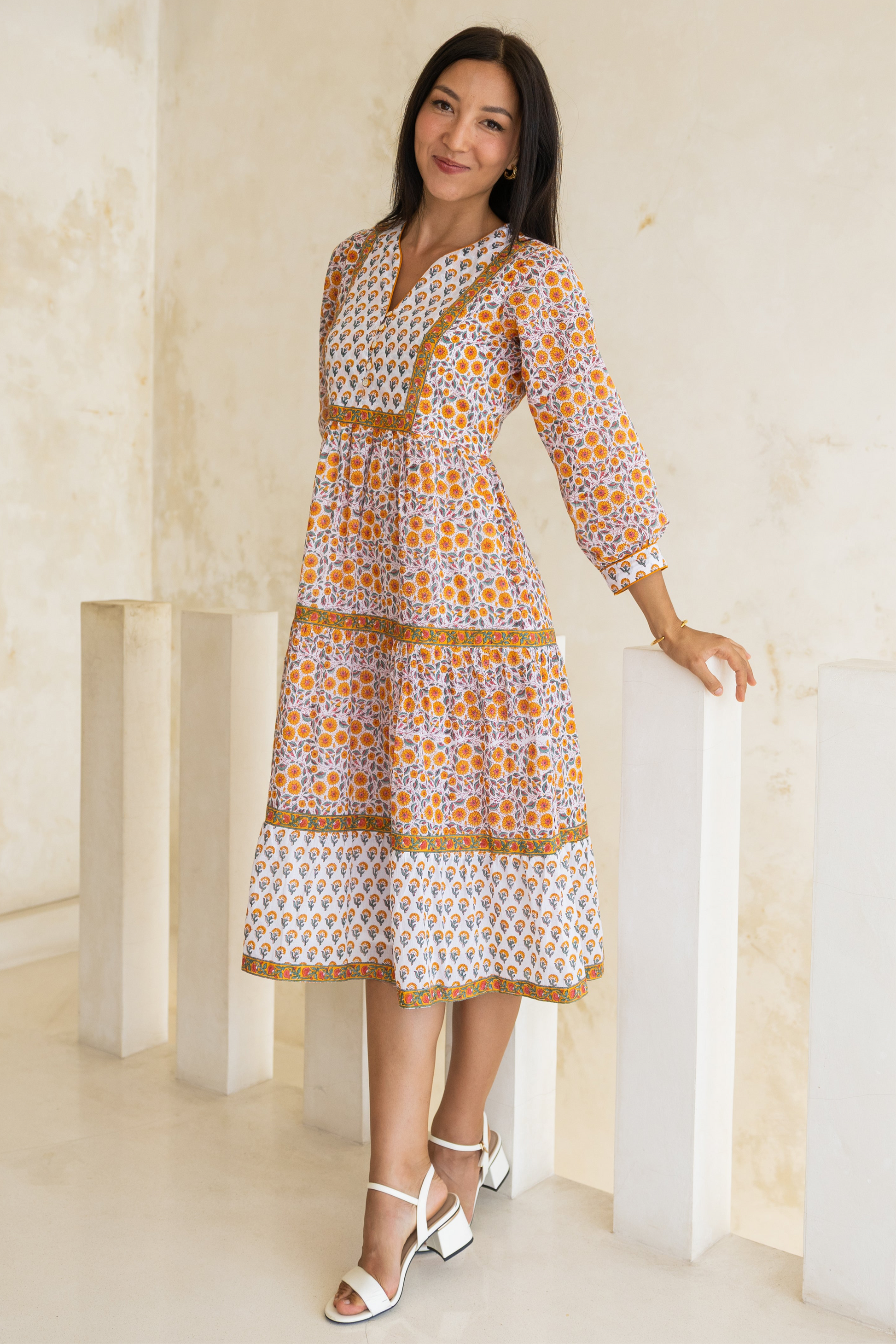 This tiered midi dress has a flowy silhouette and 3/4th sleeves. Intricate prints and borders across the dress adds to the boho feel that will never go out of style.
